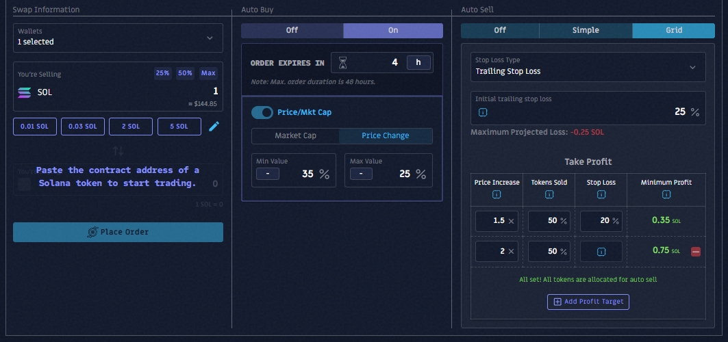 Lorsque vous utilisez cette stratégie pour acheter des tokens/pièces, vous placez un ordre d'achat limite avec des paramètres d'auto-vente avancés, plutôt que de les acheter immédiatement.