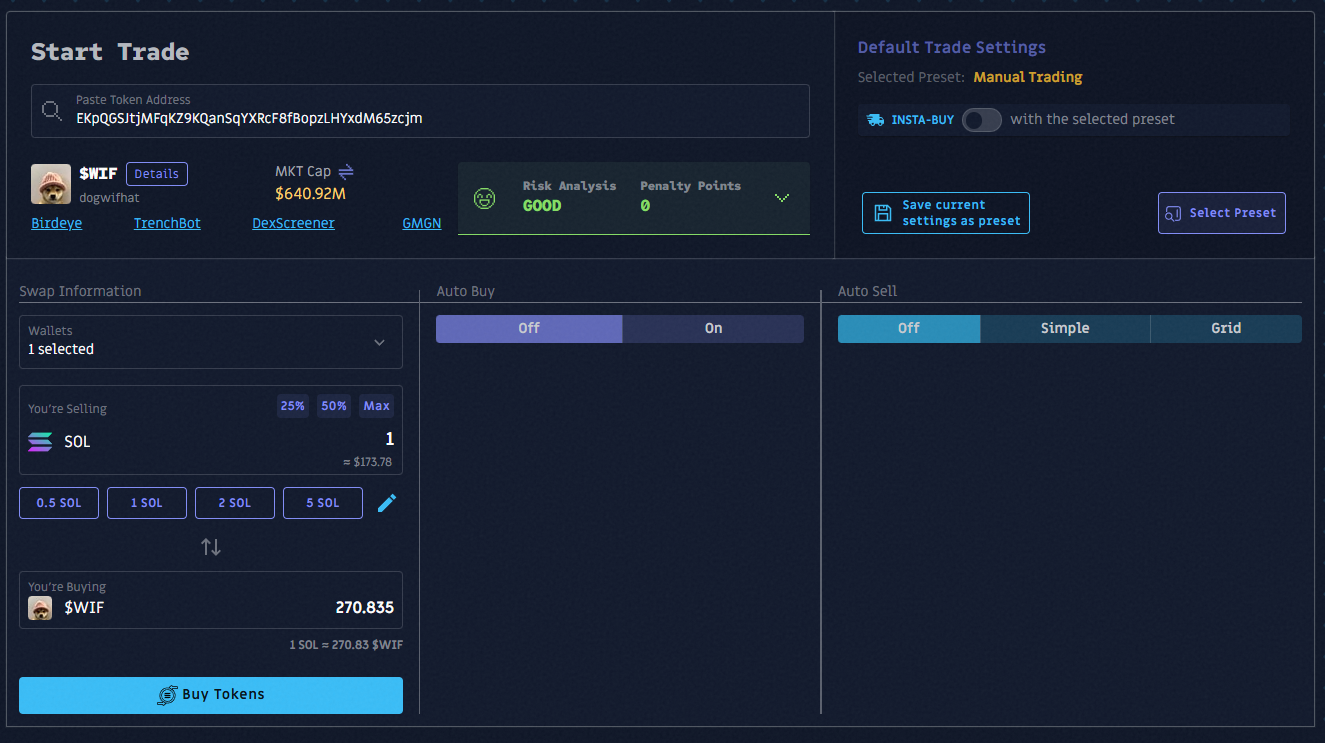 Lorsque l’option de l'Achat Instantané est activée, le token est immédiatement acheté dès que vous collez son adresse. Cette fonction est conçue pour des achats rapides lorsque chaque seconde compte.