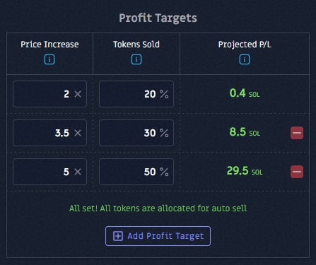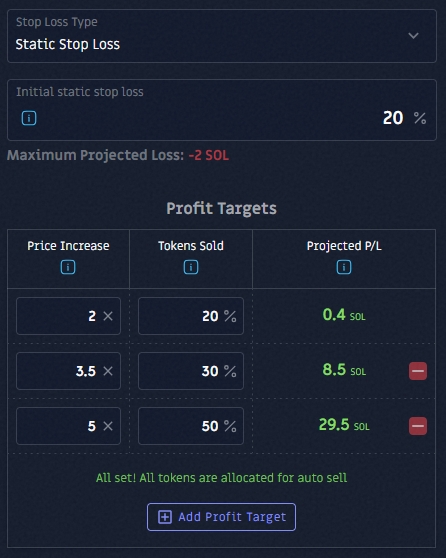Si le prix du jeton descend jusqu’au pourcentage défini avant d’atteindre votre premier objectif de profit, Sniperoo vendra automatiquement l’intégralité de votre position.