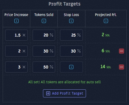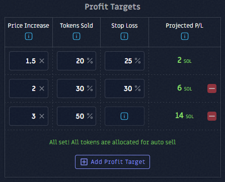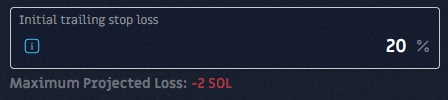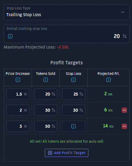 Vous avez acheté 100 jetons $WIF pour 1 SOL. Le prix de $WIF augmente, et maintenant vos 100 $WIF valent 2 SOL. Étant donné que vous utilisez une stratégie de seuil de vente progressif avec un seuil initial de 20 %, votre niveau de vente s’ajuste à 1.6 SOL (20 % en dessous de l’ATH). Si le prix de $WIF commence à chuter, dès que vos 100 $WIF atteignent une valeur de 1.6 SOL, Sniperoo les vendra automatiquement, réalisant ainsi un gain net de 0.6 SOL.