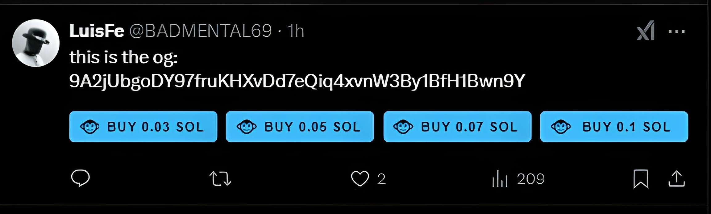 Chaque fois que vous rencontrez une adresse de token (CA) sur Twitter/X, l'extension affichera vos 4 boutons d'achat préconfigurés, vous permettant d'acheter des tokens dès que vous voyez l'adresse publiée.