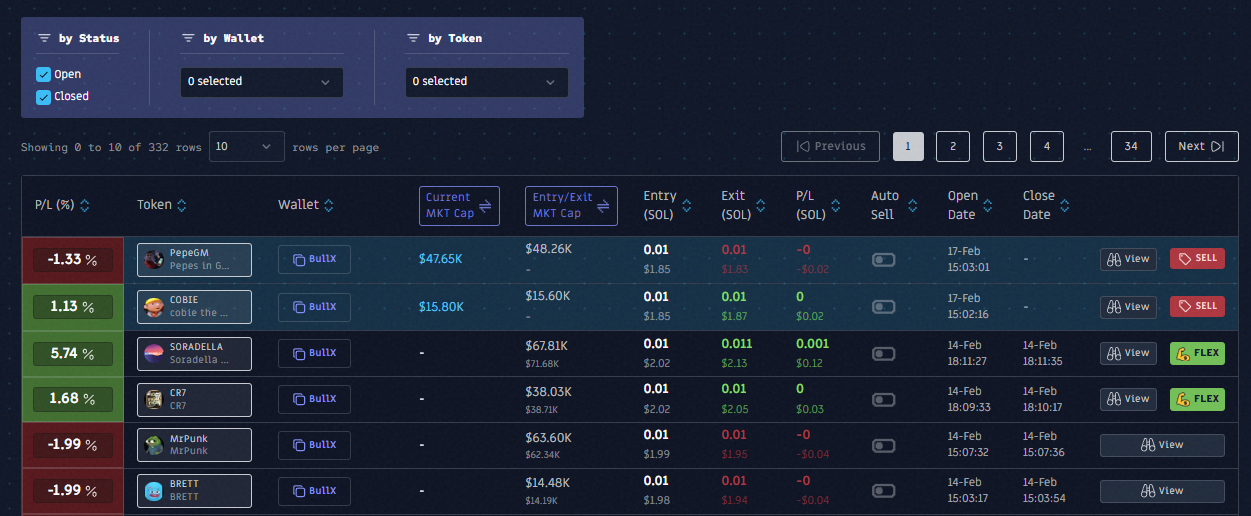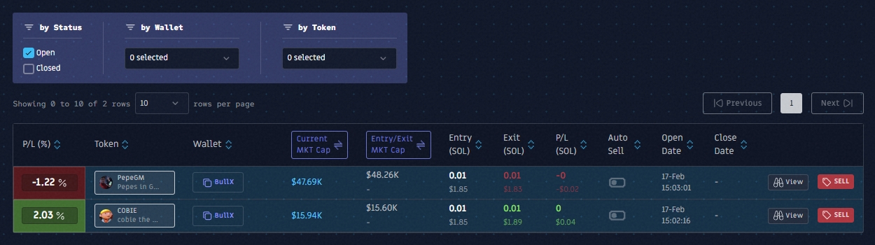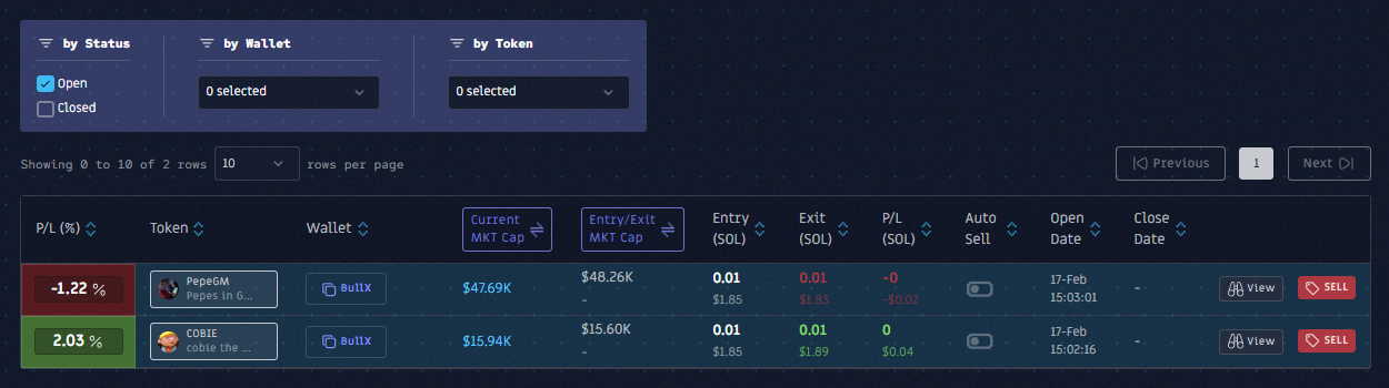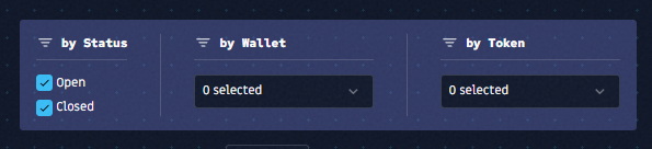 En haut de la page des positions, vous trouverez des filtres pour les positions "Ouvertes" et "Fermées". Ceux-ci servent de filtres rapides - utilisez-les pour vous concentrer sur vos transactions actives ou pour revoir votre historique de trading. Vous pouvez affiner votre vue en filtrant par portefeuilles ou tokens spécifiques.