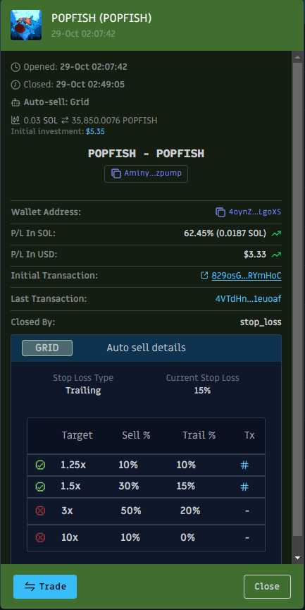 En regardant le trade POPFISH, nous pouvons voir comment une stratégie de grille réussie s'est déroulée :