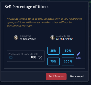 Lorsque vous cliquez sur Vendre, une fenêtre contextuelle s'ouvrira où vous pourrez sélectionner la quantité de tokens que vous souhaitez vendre.