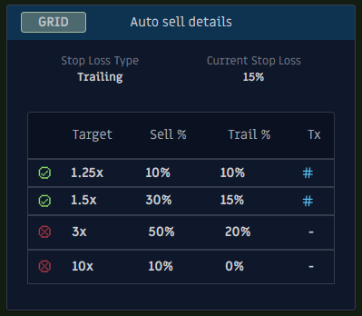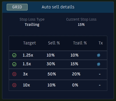 Une caractéristique clé que vous remarquerez est l'indicateur Grille dans la colonne "Vente Automatique". Cela vous indique qu'une stratégie automatisée protège votre position. Lorsque vous voyez cet indicateur, cela signifie que votre position dispose de points de sortie prédéfinis.