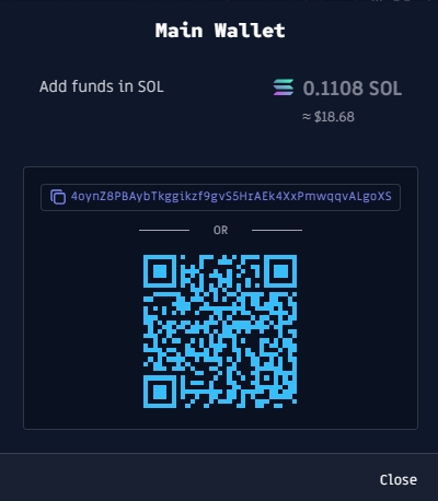 Pour ajouter des fonds, vous pouvez simplement copier le lien ou scanner le code QR et envoyer des SOL depuis votre CEX (comme Binance, CoinBase, KuCoin), Phantom ou tout autre portefeuille qui supporte le réseau Solana.