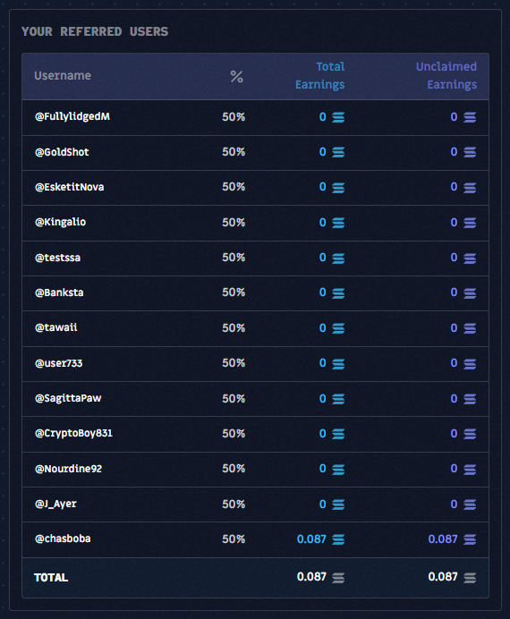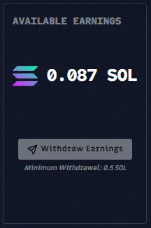 Cela montre tous vos gains accumulés grâce au parrainage qui sont prêts à être retirés. Le seuil de retrait minimum est de 0,5 SOL - une fois que vous avez atteint ce montant, vous pouvez demander un retrait.